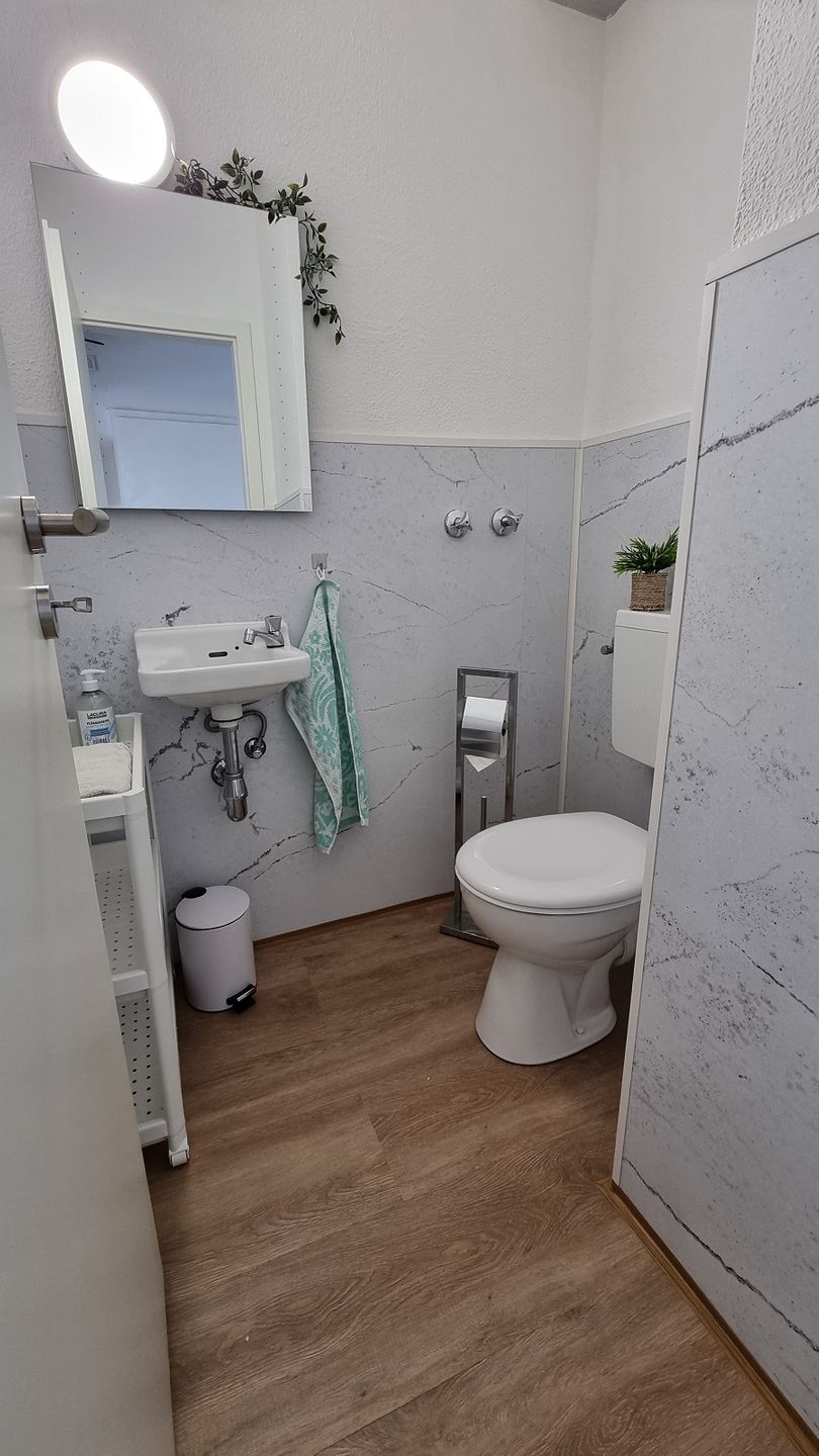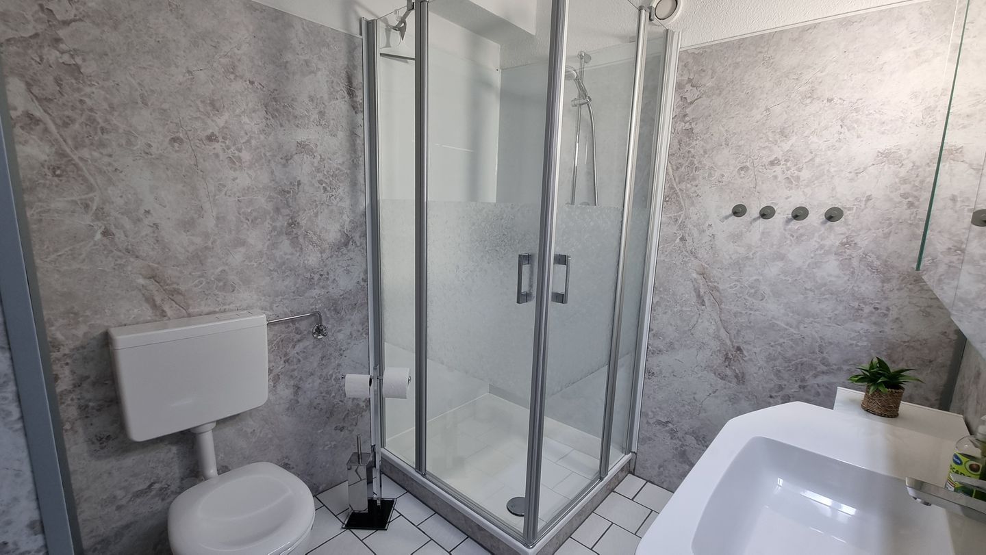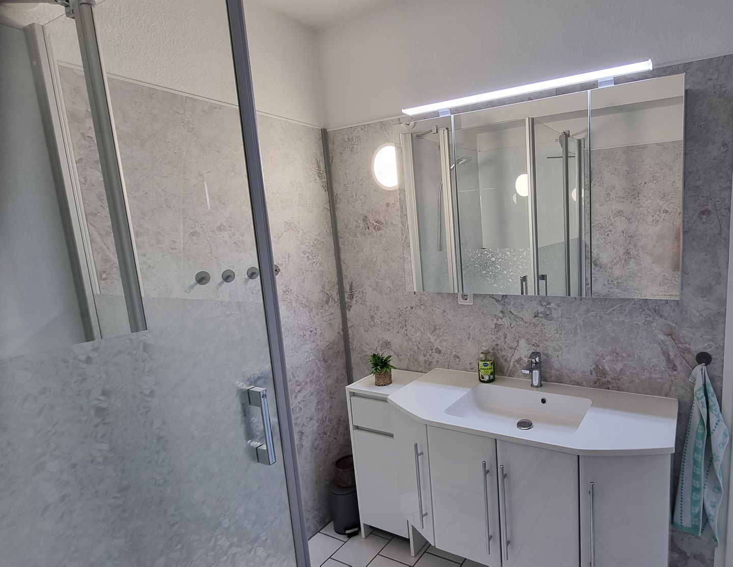 Ein geräumiges Bad mit Dusche, WC und Fön gehören ebenso zur Ausstattung wie ein separates kleines Gäste-WC.